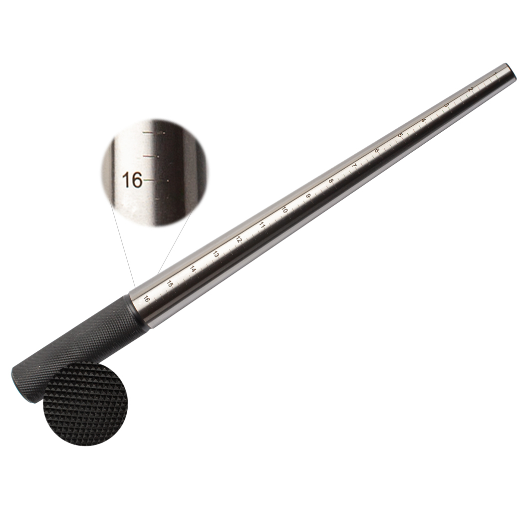 Professional quality ring mandrel: USA ring sizes 1-16 in 1/4 increments. Textured handle for superior grip. Hardened Steel.