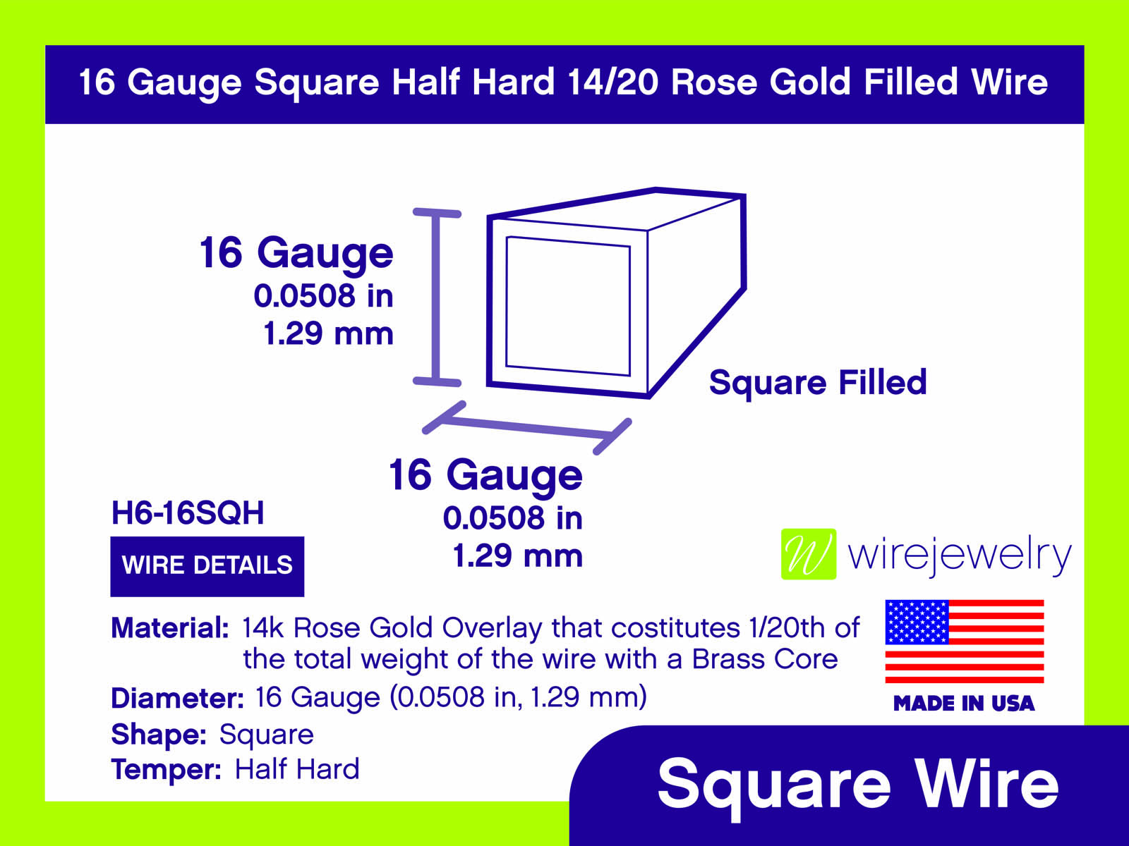 16 Gauge Square Half Hard 14/20 Rose Gold Filled Wire